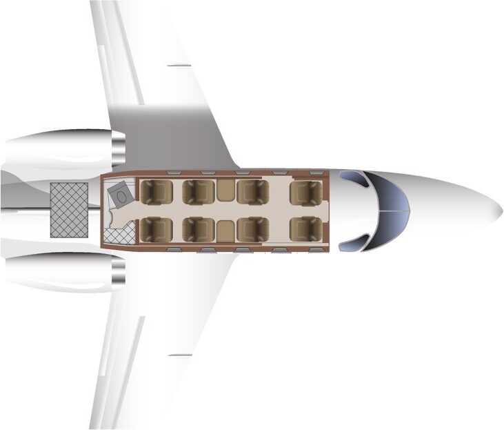 Features a Nine (9) passenger seating configuration with a Center Club arrangement finished in Black Leather with Smoked Nickel plating throughout. Includes an Aft fully enclosed lavatory. Interior currently undergoing refurbishment (2026)