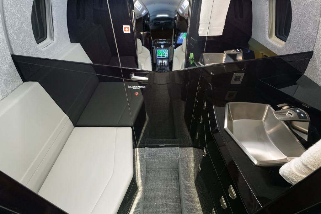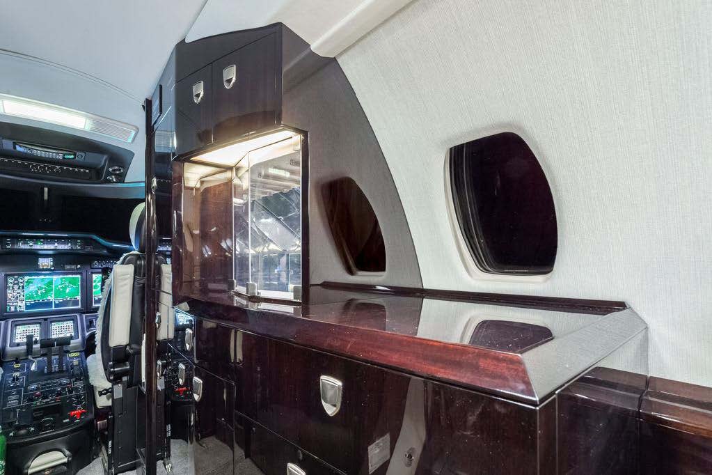 Forward cabin: A right-hand extended refreshment center with ice chest, numerous flexible storage areas, trash container, and provisions to store catering. A left-hand closet, forward of the cabin entry door, provides storage for the navigation charts, flight manual, and general storage.