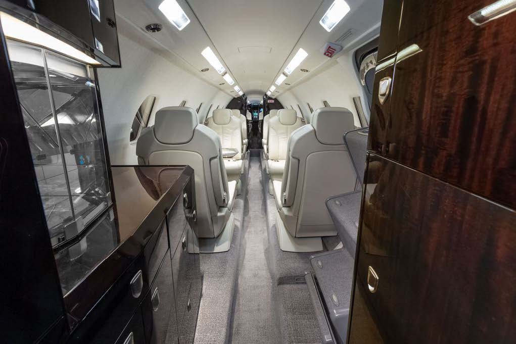 Main Cabin: Eight (8) pedestal-mounted passenger seats with adjustable headrests that can track forward/aft, laterally, and swivel 360 degrees. Four (4) fold out tables with ample work area is included. There are five (5) individual 110 VAC outlets throughout the aircraft. The refreshment center also has its own high-powered outlet.